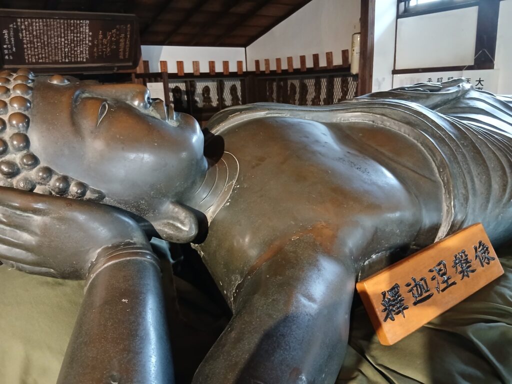 釈尊入滅の姿の仏像です。頭は北、お顔は西、頭北面西(北枕)で寝ておられます。